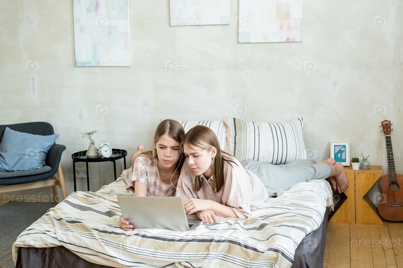 Спокойные подростковые близнецы в наушниках смотрят фильм онлайн