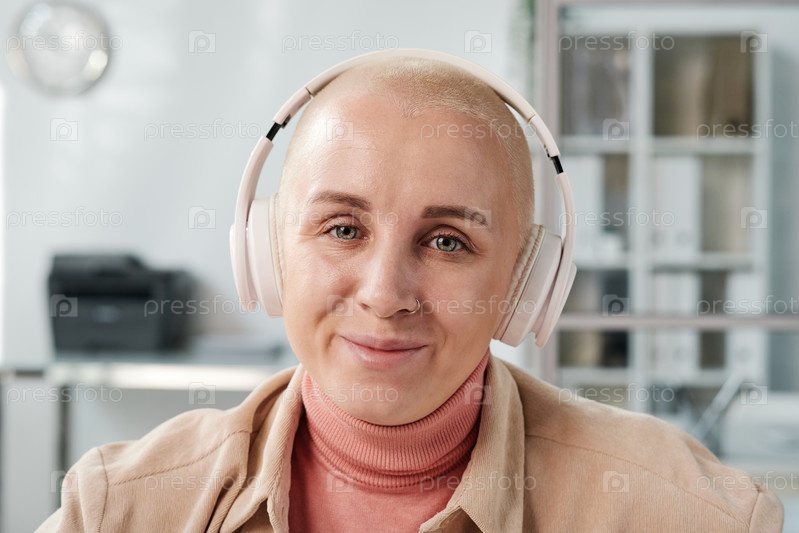 Портрет улыбающейся молодой женщины с лысой головой, слушающей аудио в беспроводных наушниках