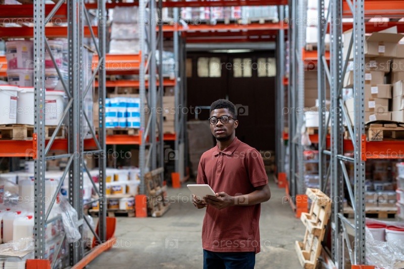 Серьезный менеджер большого склада, использующий планшет