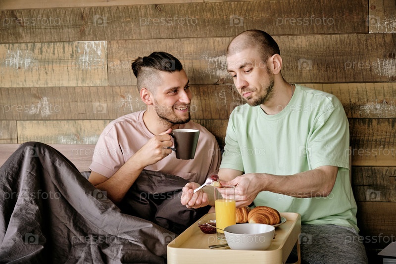 Молодой гей кладет печенье в рот своему парню