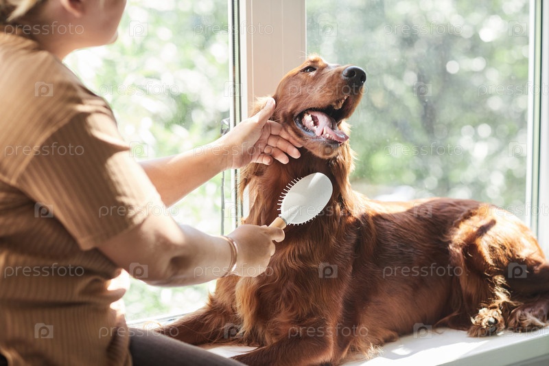 Женщина, чистившая собаку на солнце