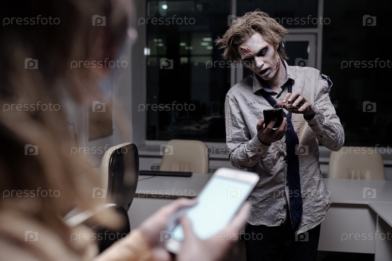 Мертвый и жуткий бизнесмен с зомби-мазью на лице и руках прокручивает в смартфоне