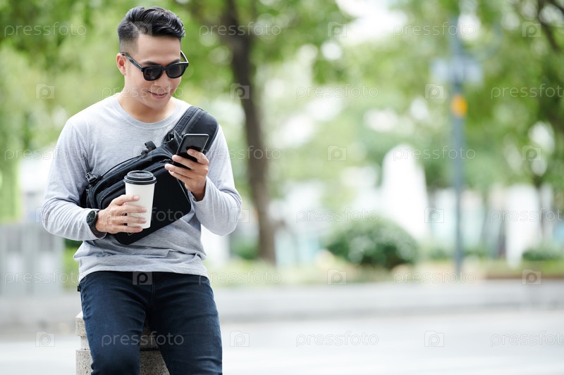 Азиатский парень в солнцезащитных очках отправляет смс