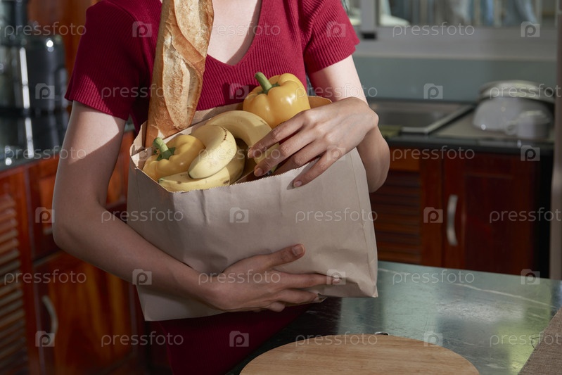 Непризнанная женщина обнимает сумку со свежими продуктами
