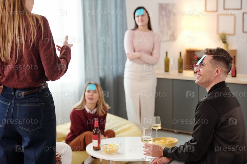 Две девушки в повседневной одежде пытаются угадать свои имена, написанные на клейких тетрадях