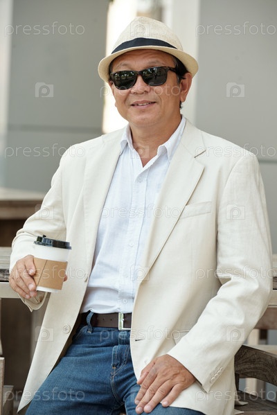 Расслабленный бизнесмен с кофе на открытом воздухе