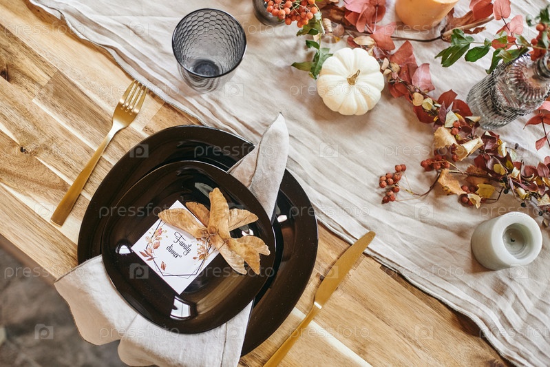 Площадь тарелок с приглашением на семейный ужин и сухие осенние листья