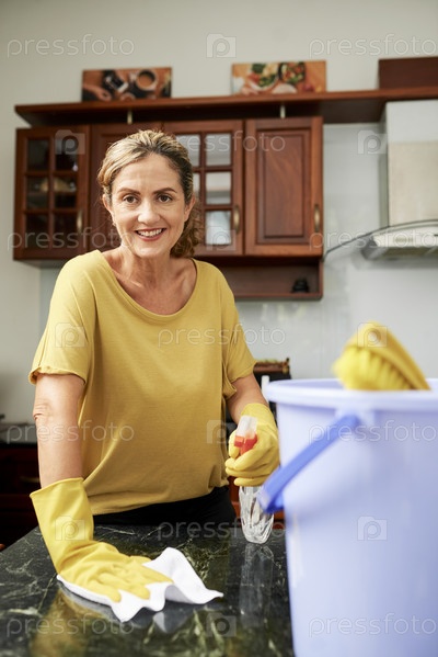 Женщина, стирающая кухонный стол
