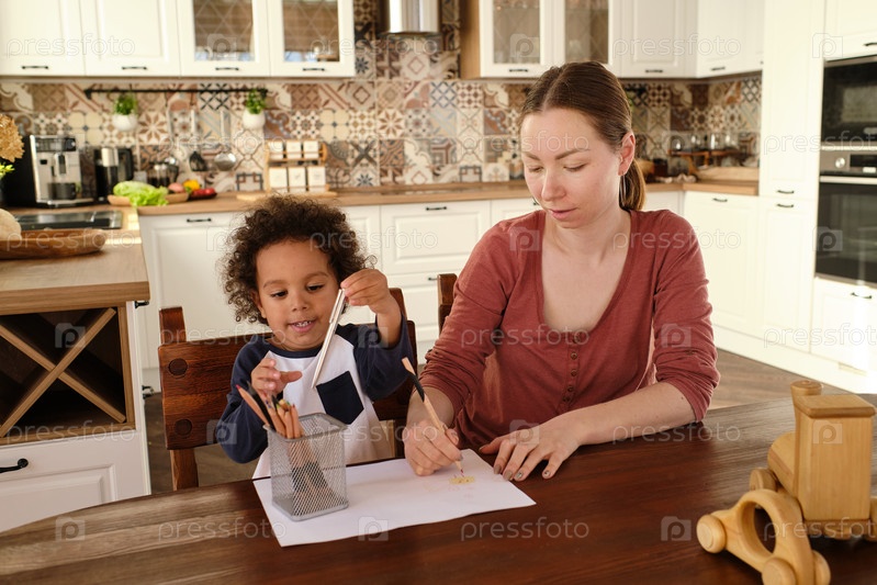 Милый мальчик берет карандаш, пока его мать рисует картину на бумаге