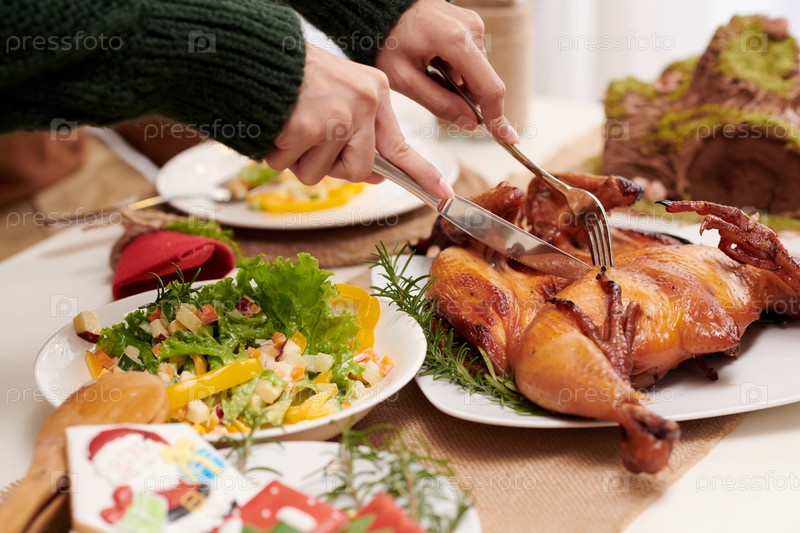 Женщина режет жареную курицу для гостей