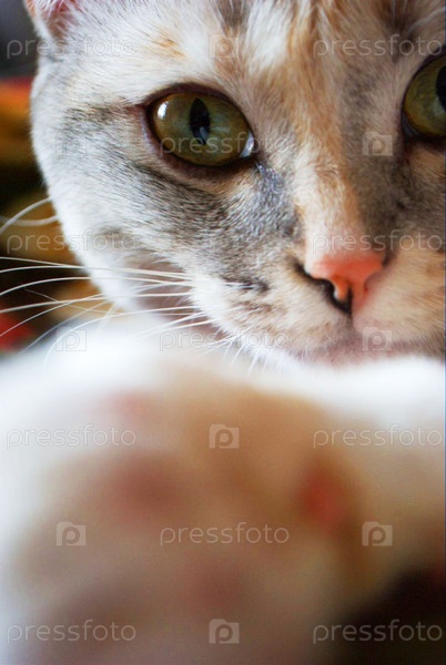 Морда кошки с лапой крупным планом
