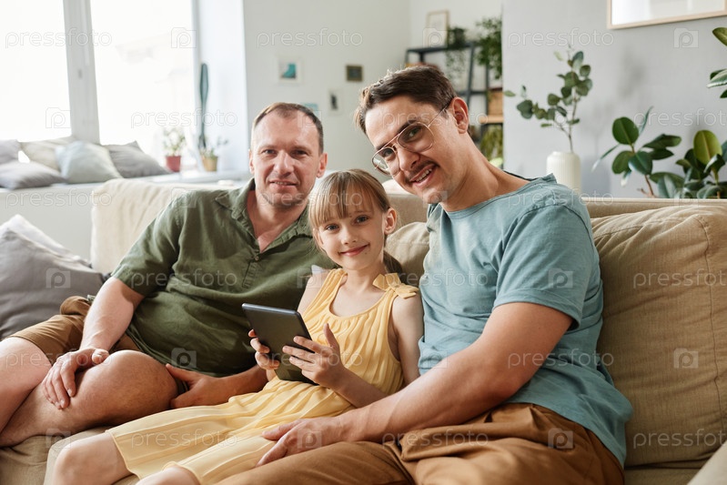 Гей-семья, использующая планшетный компьютер дома