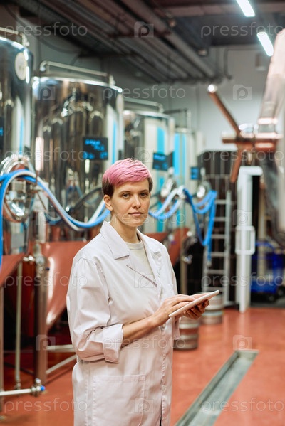 Молодая эксперт по пивоваренному заводу в белом халате смотрит на вас во время ввода данных