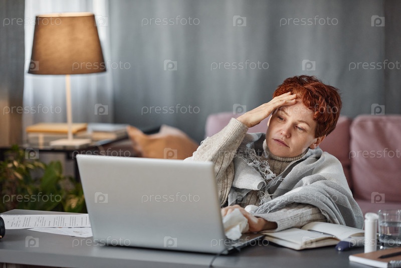 Портрет зрелой женщины, страдающей гриппом с сильной головной болью в теплом наряде, сидящей за столом в гостиной дома и пытающейся работать