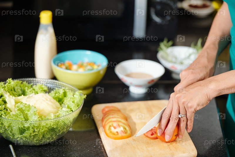 Домашняя хозяйка режет свежие помидоры