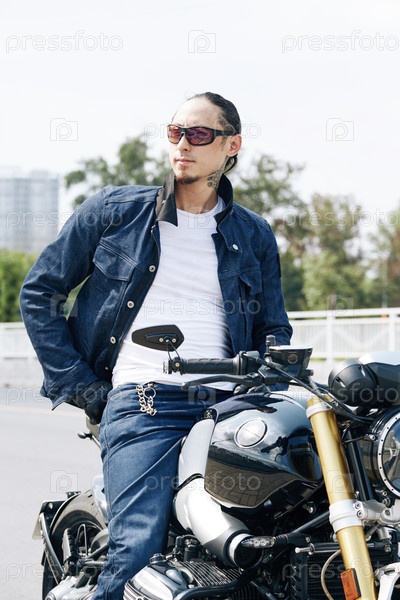 Красивый мужчина сидит на мотоцикле