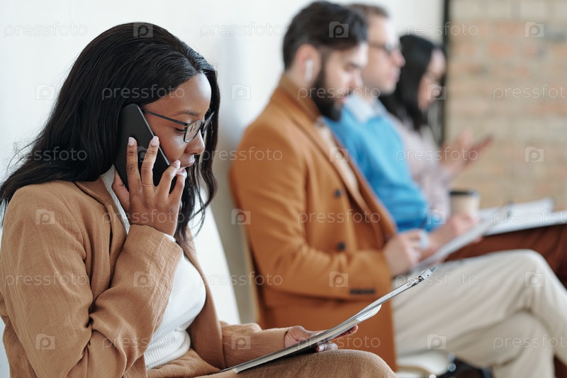 Чернокожая женщина разговаривает по телефону в ожидании собеседования на работу