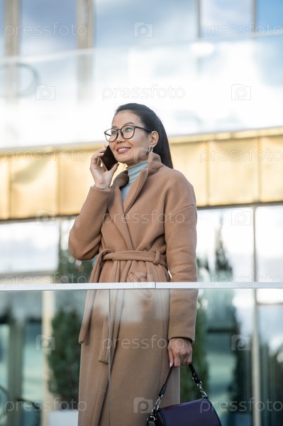 Улыбающаяся азиатская бизнесвумен в бежевом пальто разговаривает на мобильном телефоне снаружи