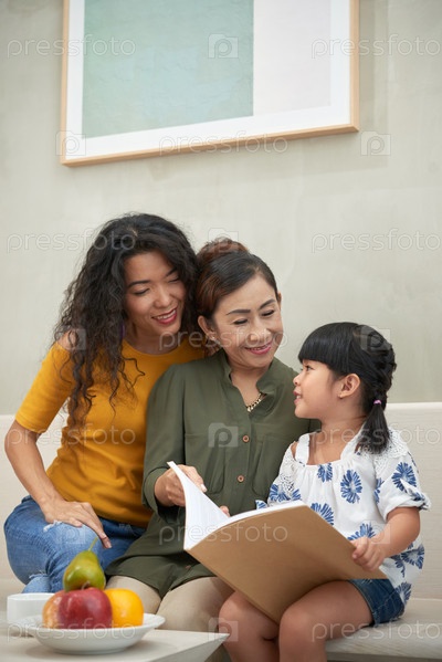 Бабушка читает книгу с внучкой