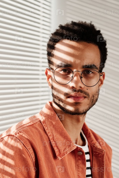 Портрет серьезного молодого чернокожего мужчины в круглых очках и коралловой рубашке, сидящего на закрытых жалюзи