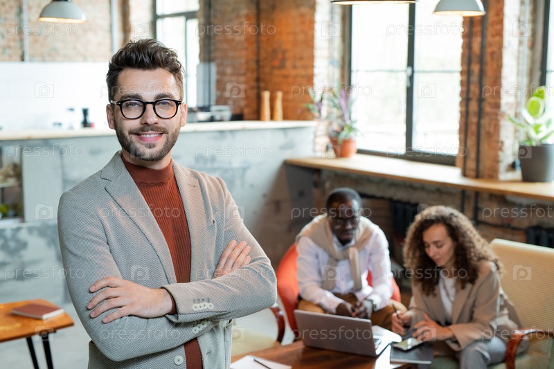 Молодой успешный бизнесмен с перекрещенными руками на груди