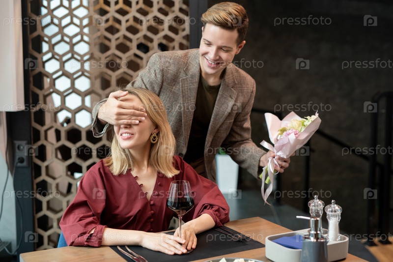 Веселый парень с букетом цветов, покрывающий глаза своей девушки рукой