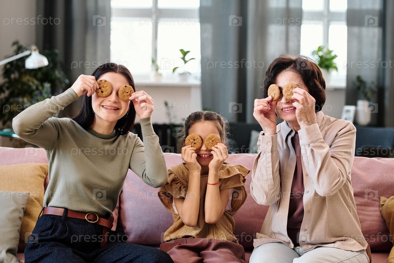 Молодая веселая мать, счастливая бабушка и очаровательная девочка с печеньем