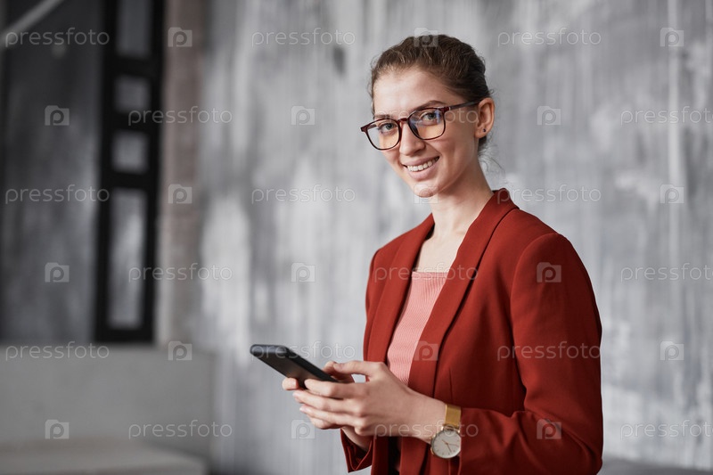 Улыбающаяся деловая женщина в красном платье
