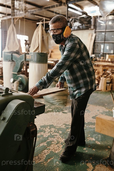 Плотник, работающий в защитных масках и наушниках