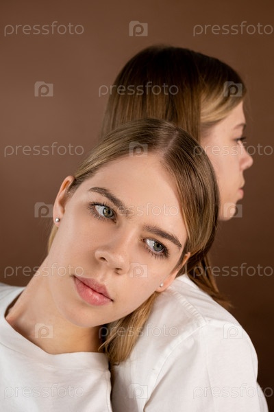 Молодая красивая женщина, опирающаяся на плечо своей сестры-близнеца
