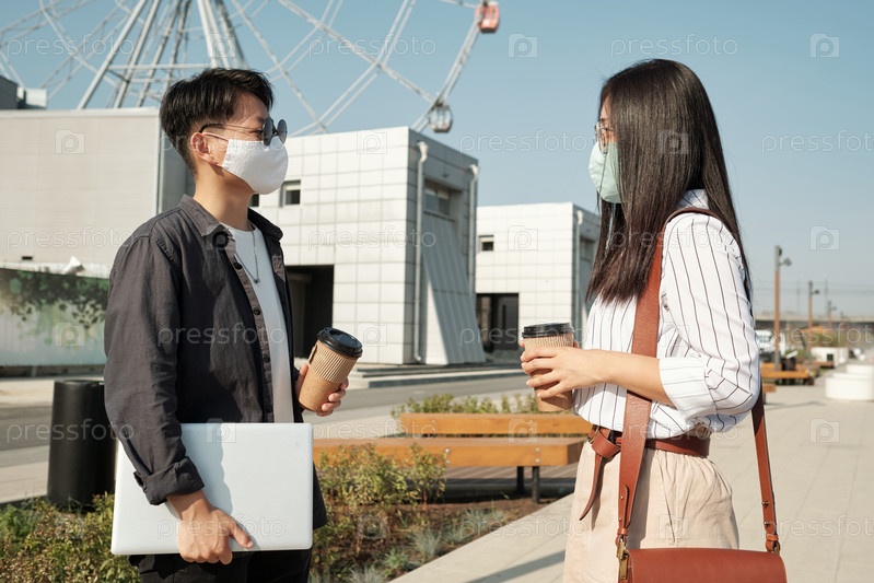 Два молодых коллеги в защитных масках смотрят друг на друга
