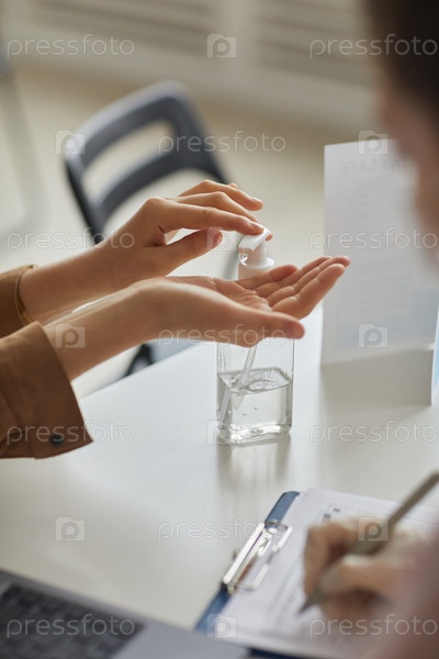 Женщина, использующая дезинфицирующее средство для рук в клинике Close Up