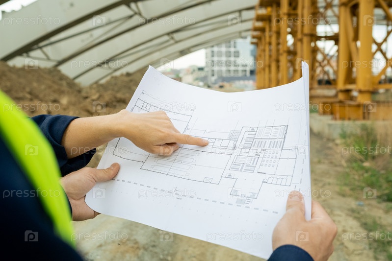 Рука женщины-инженера, указывающей на эскиз незавершенного строительства