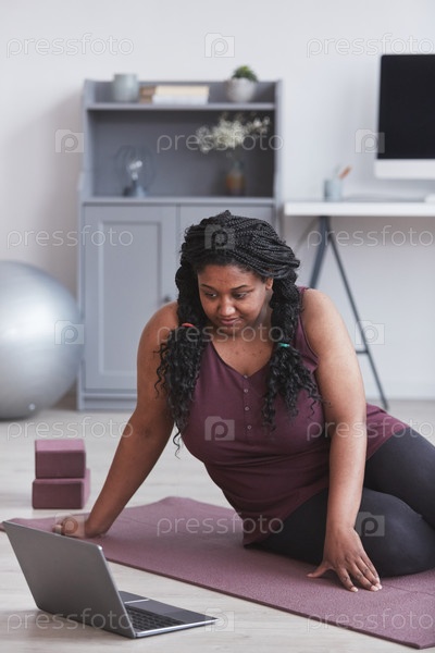 Афроамериканская женщина с избыточным весом смотрит видео тренировки