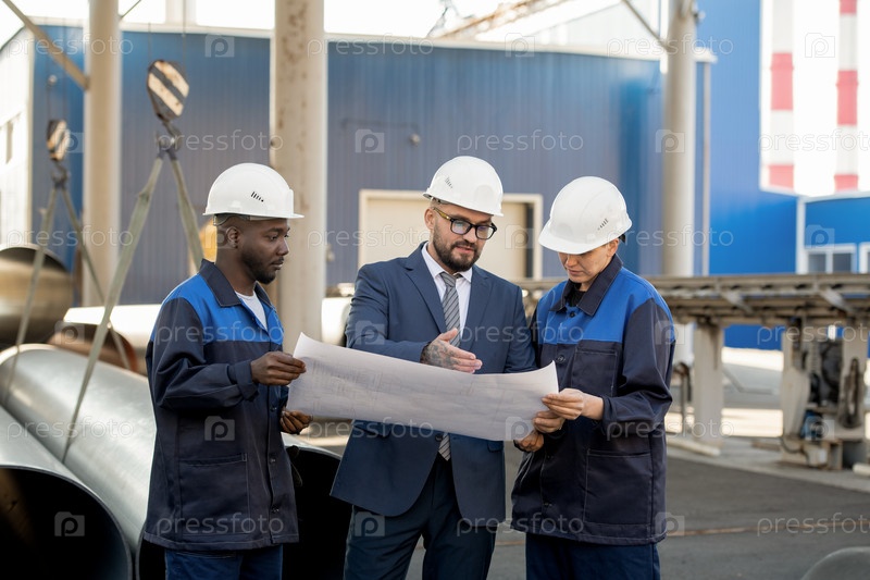 Группа из трех современных рабочих промышленного завода обсуждает развернутый план с эскизами