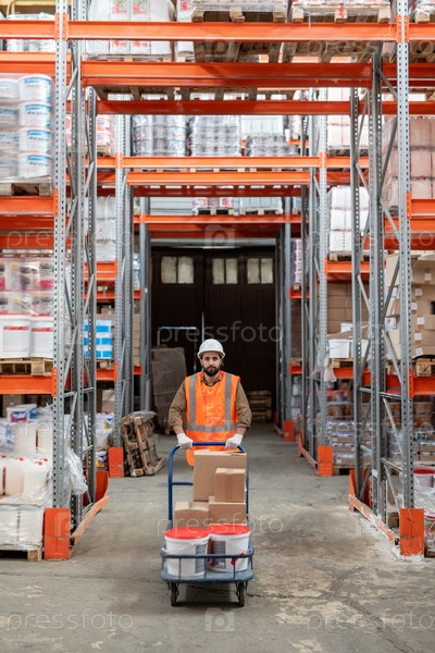 Погрузчик в рабочей одежде движется вперед между стойками
