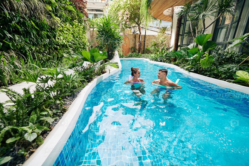 Пара плавает с пенными лапшами