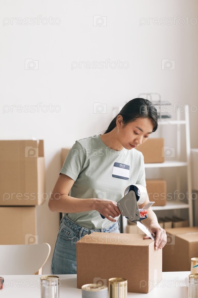 Женщина упаковывает коробки с благотворительными пожертвованиями