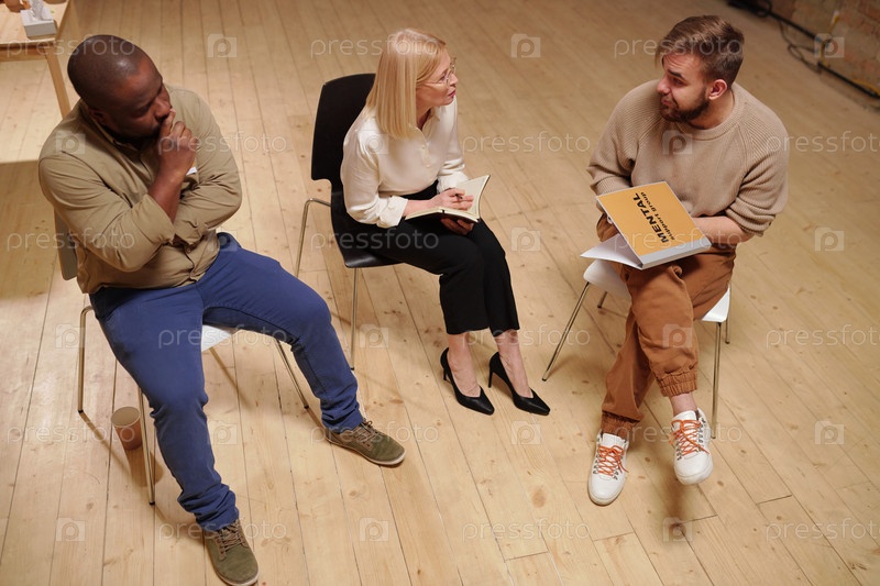 Зрелая консультантка консультирует двух межкультурных мужчин