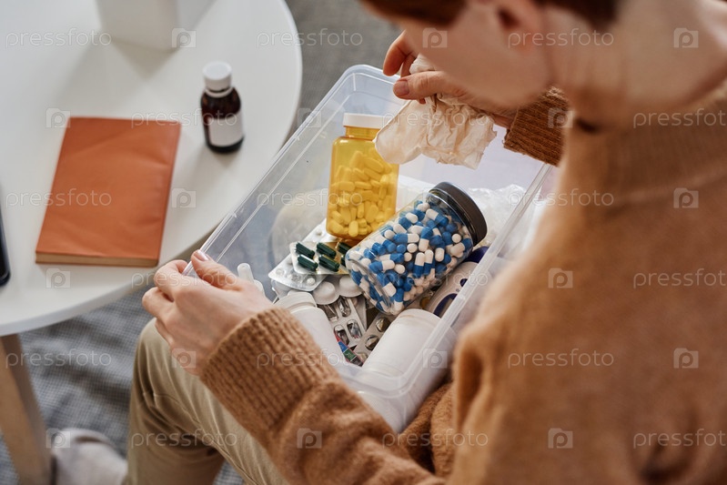 Высокоугольный средний ближайший снимок неузнаваемой женщины, страдающей лихорадкой, сидящей на диване с аптечкой первой помощи на коленях в поисках таблеток