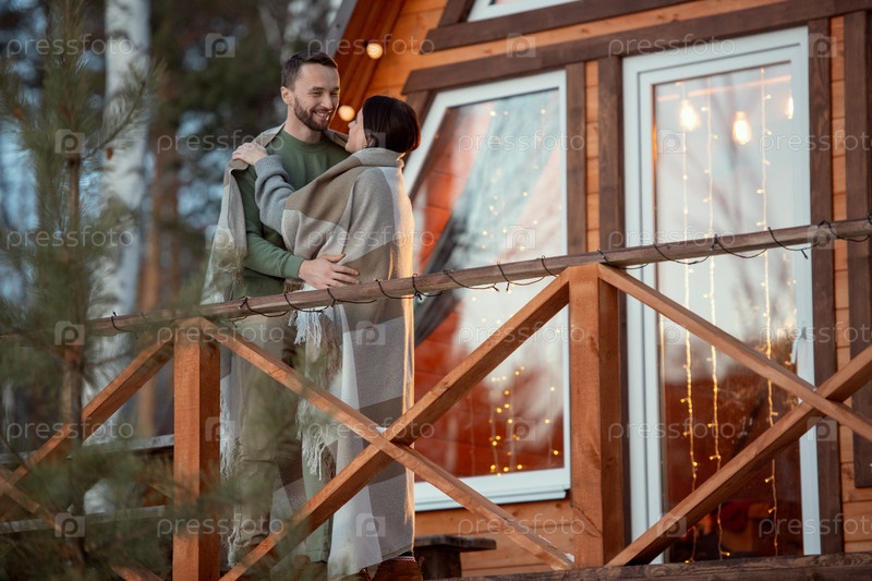 Счастливая молодая любовная пара, завернутая в ковры и стоящая друг перед другом