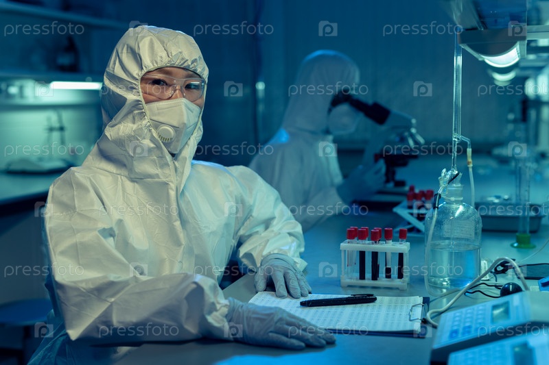 Молодая исследовательница в комбинезонах и другой защитной рабочей одежде