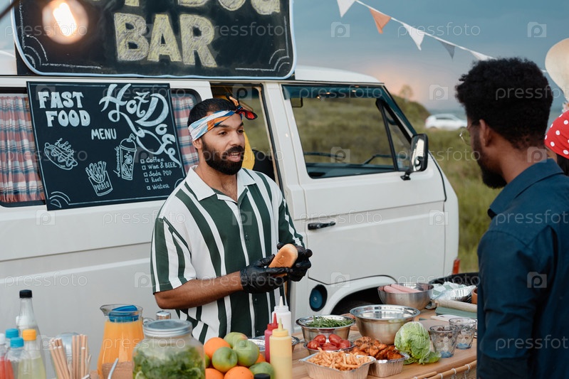 Мужчина готовит хот-доги на свежем воздухе