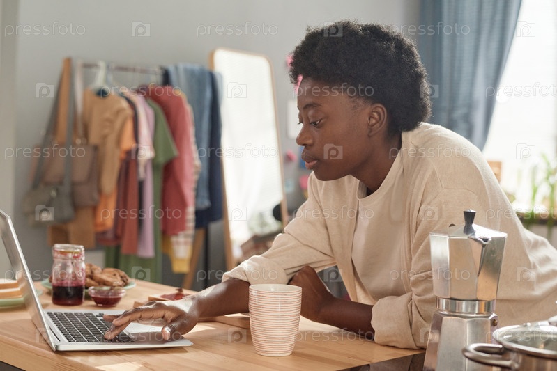 Женщина работает на ноутбуке во время завтрака