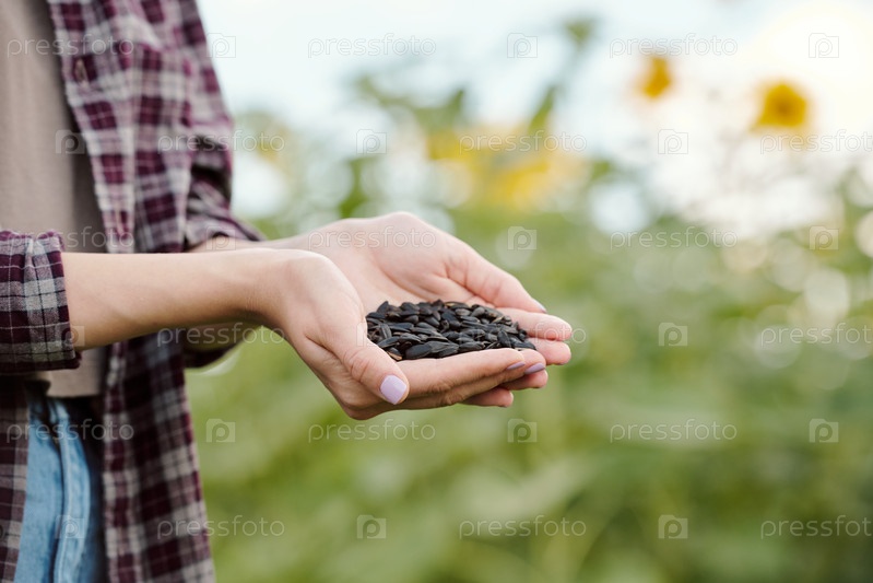 Зрелая брюнетка-женщина в шапке и повседневной одежде забирает свежие семена подсолнечника