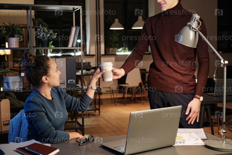Молодой человек дает коллеге чашку кофе, пока они работают в офисе по ночам