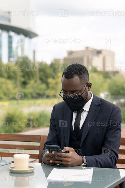Молодой африканский бизнесмен в костюме и черной маске пишет сообщения у стола