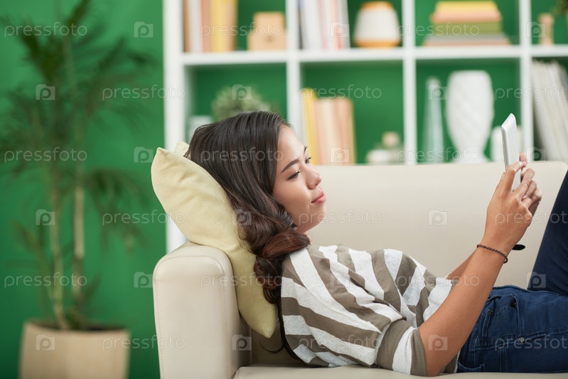 Женщина отдыхает на диване с планшетом