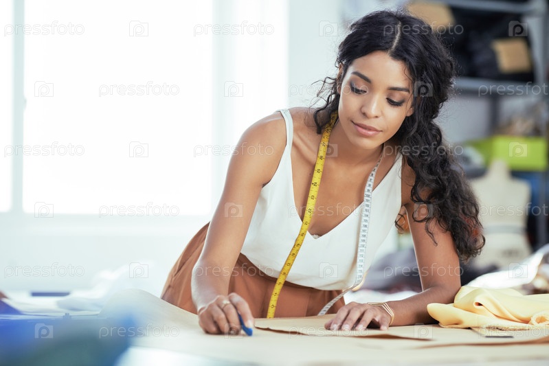 Швея, делающая заметки по бумажному шаблону