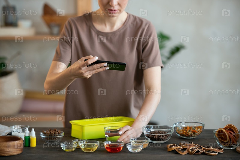 Молодая ремесленница со смартфоном стреляет в миски, содержащие эфирные масла